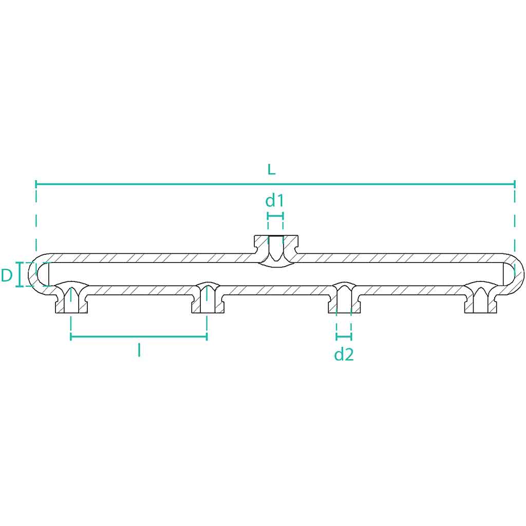 تعداد خروجی | قطر داخلی کولکتور D (mm) | فاصله مرکز تا مرکز خروجیهاI (mm) | قطر انشعاب خروجیd2 (inch) | قطر انشعابd1 (inch) | طول کولکتورL (mm) |