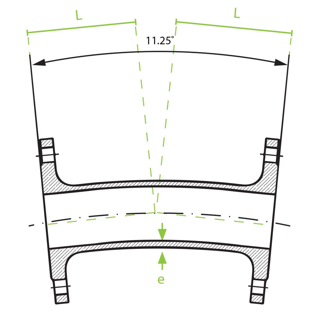 جهت اتصال دو لوله با انتهای فلنجدار که نسبت به یکدیگر زاویه 11.25° دارند، استفاده میشود. استاندارد فلنج بر اساس DIN EN 1092 – 2. استاندارد ابعاد بر اساس ISO 2531. استاندارد ریختهگری بر اساس DIN EN 1693.